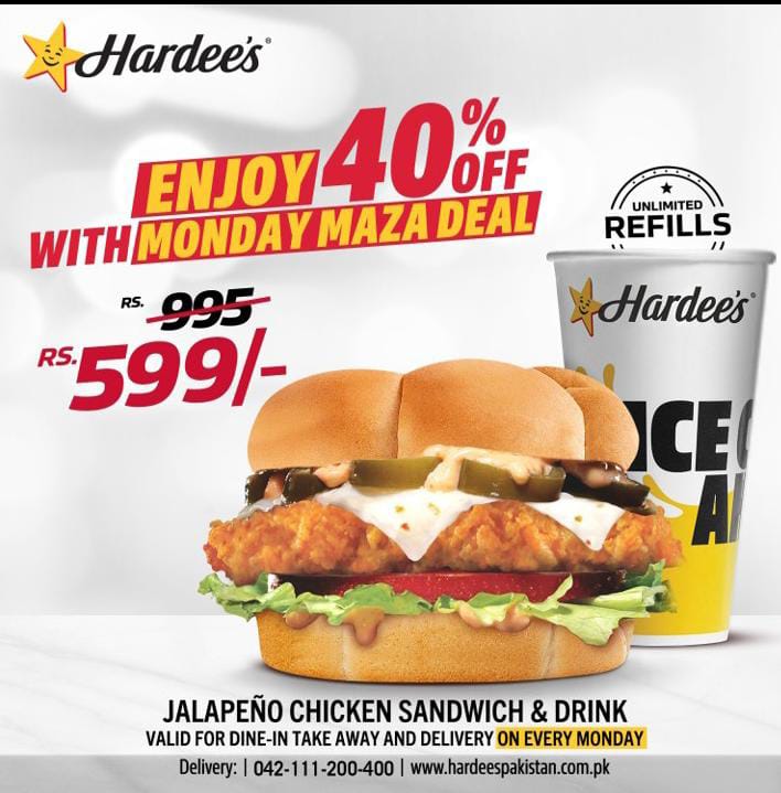 The Hardees deals also provide 10% off on all online orders. You have to visit their website or discountspk and search for your favorite dish and place the order. It offers different bank discount patterns. In its chicken classic brunch, it gives a 20% discount, and you got a lot of food in only 1200 RS. Three meal is another deal and its starts from Rs 799 rs and it also has 15 others deals. The Hardees is linked with discountspk, and it promotes its sales and advertisements. It gives a 10% to 20% discount on different online orders and different burger deals. It also gives flamingo deals which starting from Rs 780 and so on. It also offers Ramadan deals which are between Rs 900 to Rs 1500, and it also gives 5 % off on soft tacos. It also gives 205 discount deals on Philly fries, 3 meat burgers. It also offers different amazing deals and 20% off on Donut burgers, the star with cheese, double western bacon with cheese club sandwich, Melt, cheesesteak, and many other food items at very low prices. In their deals many delicious and tasty s fries, tangi fries, garlic mayo, smoky, wing strips, and also onion strips are available, and they give 5% off on their all deals. The maximum deal price is 1500 PKR. We intend to remain and leaving the impressions that urge our customers to adore you.